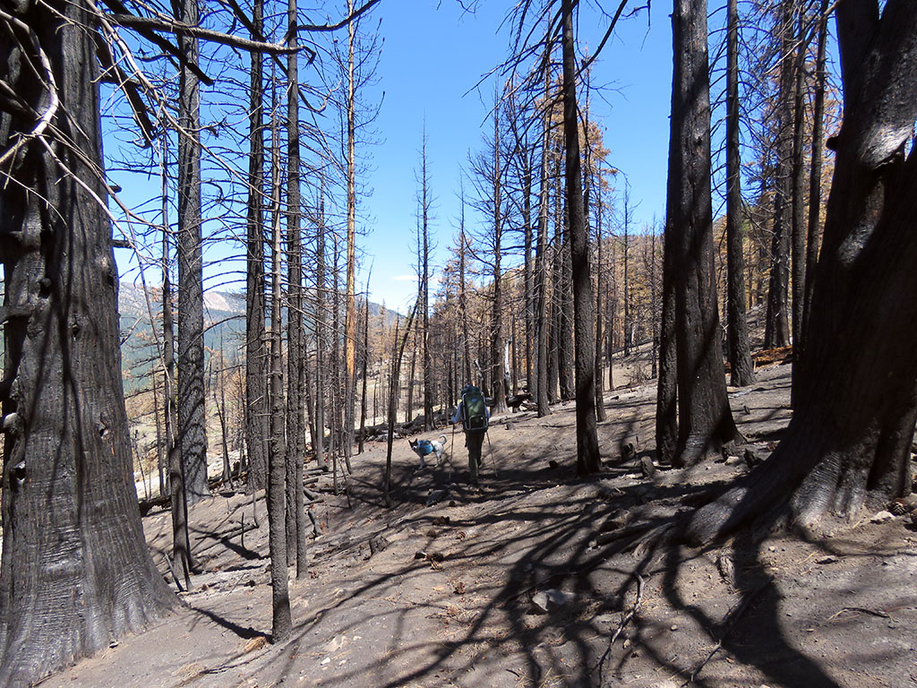 Fires burn, skip a patch and burn some more. This is normal fire behavior and helps the forest return to health. This area got burned rather badly, and some of the trees even tipped over, leaving large holes and huge obstacles we needed to navigate around. |