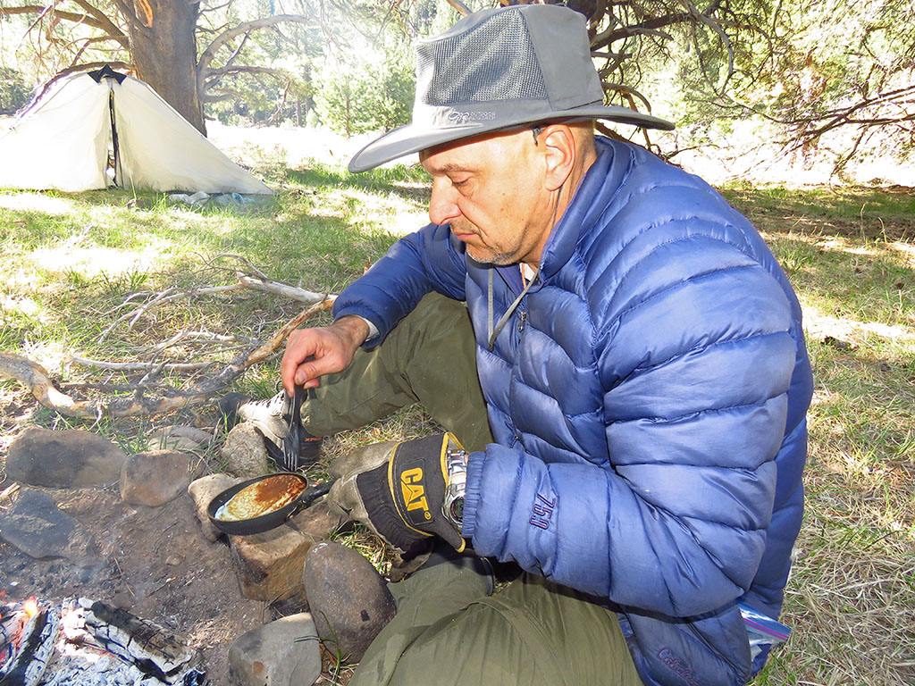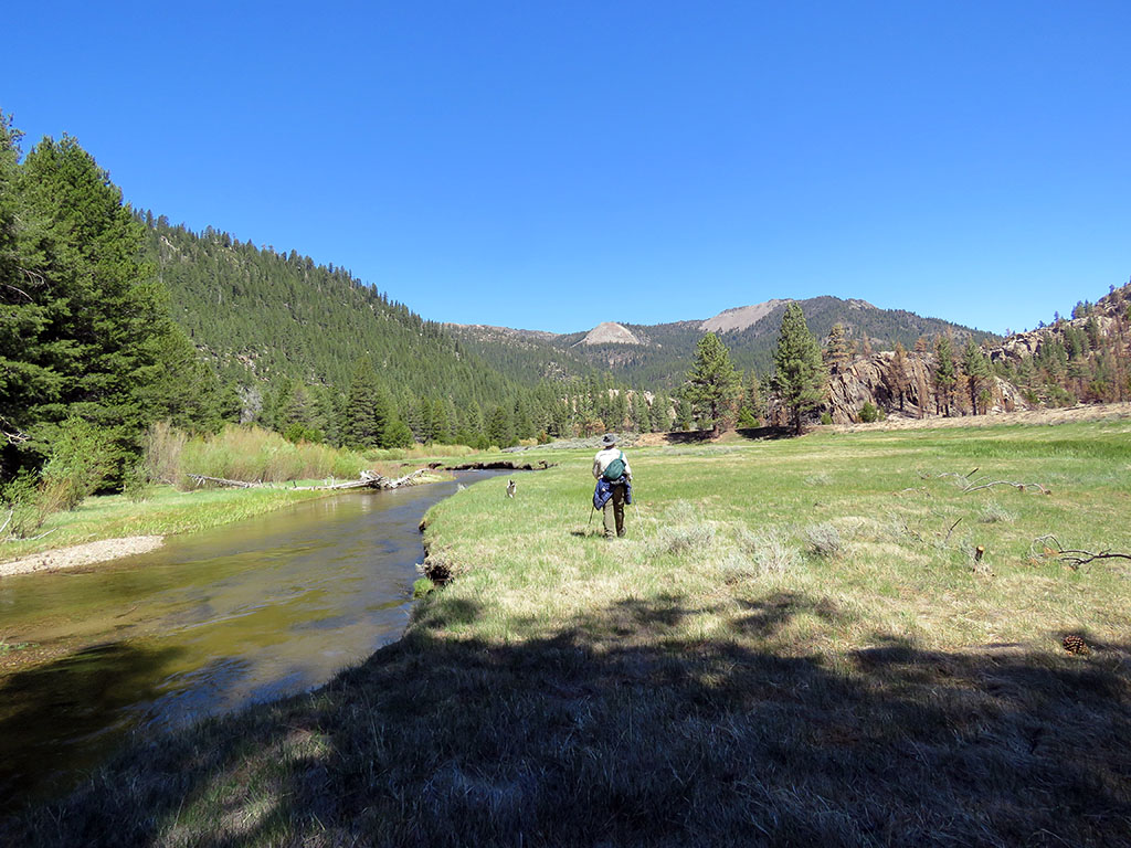 We plan to stay for several days here along the river, so I suggest that today we day hike downriver to investigate how we will cross the river to get out to Andra's car. My car is parked on the east side of the Sierras and Andra's is on a mountain pass on the other side of the river and over those mountains in the distance. When we leave, we will walk downriver, cross, and then climb over the mountains and down to her car. Since we've never been that far down the river, it is possible there is no safe place to cross it, if for instance, the river narrows into a channel where perhaps the valley narrows. By checking it out today, we can plan an alternative exit strategy if we find it uncrossable. | ||