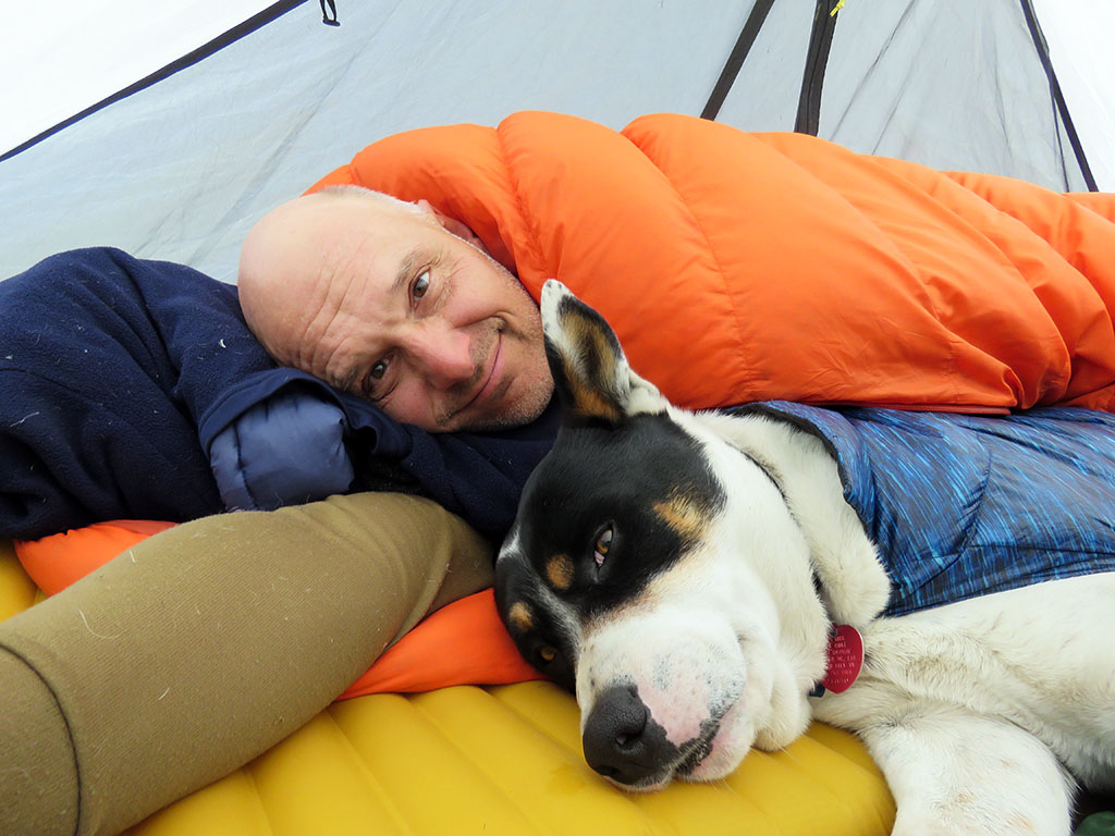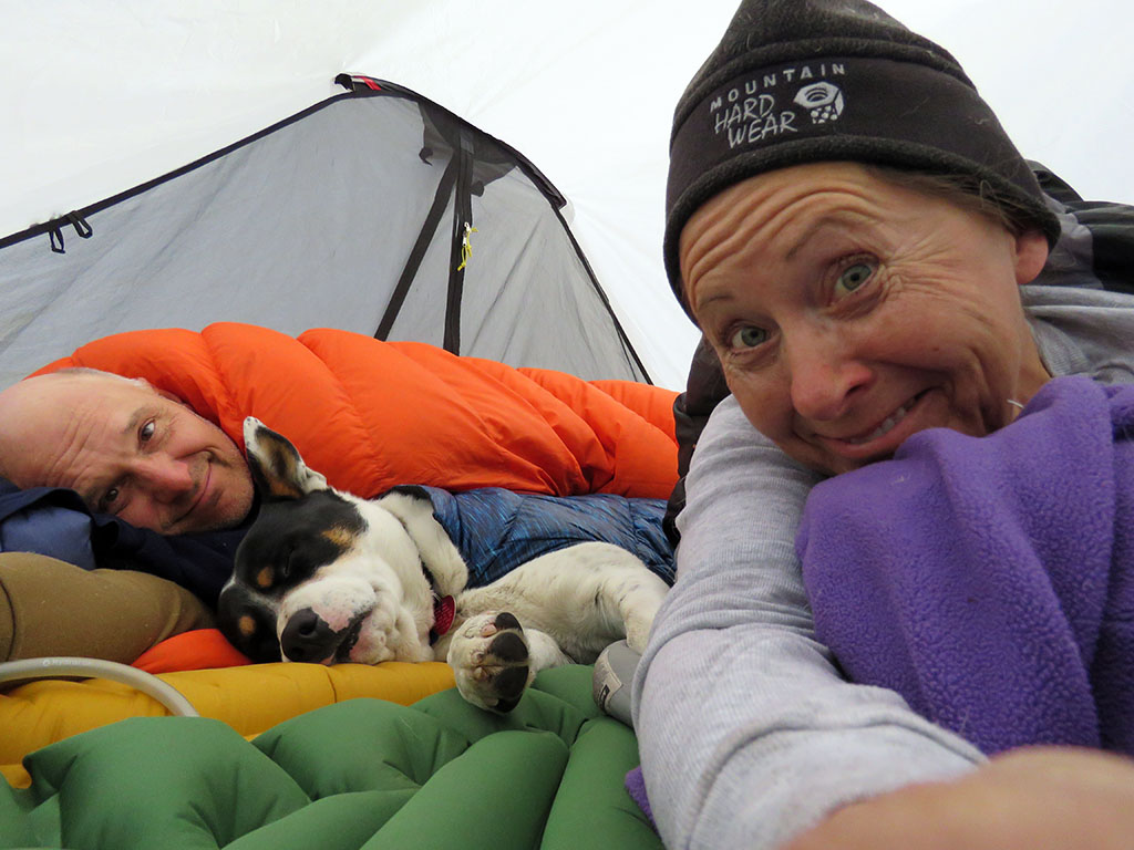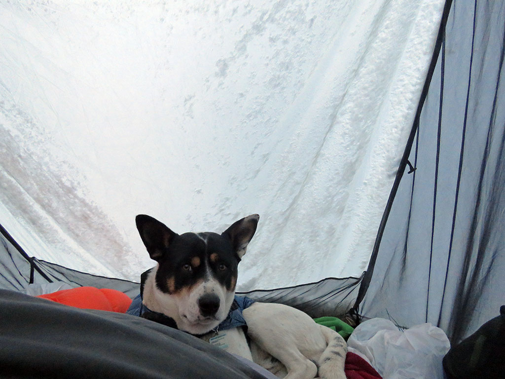 The snow just keeps coming, and I shed snow off the tent throughout the night. Here we are the next morning, and I'm still banging the tent walls to get the heavy snow to slide off. Dawg is already up and ready to go as soon as we get dressed. | ||