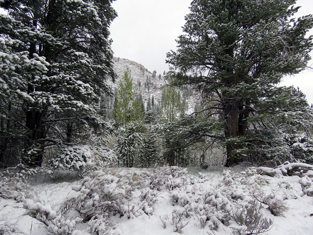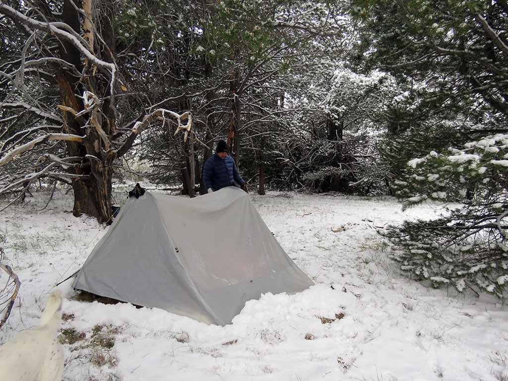 When we exit the tent, it looks like a winter wonderland. The formerly green landscape is all white. It is time to find dry wood and build a fire for breakfast. |