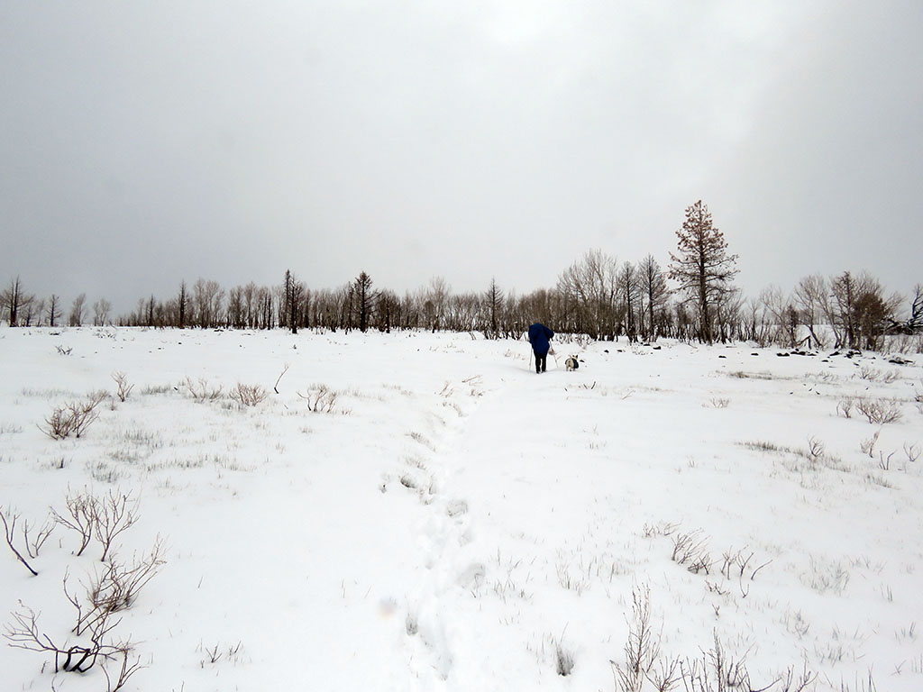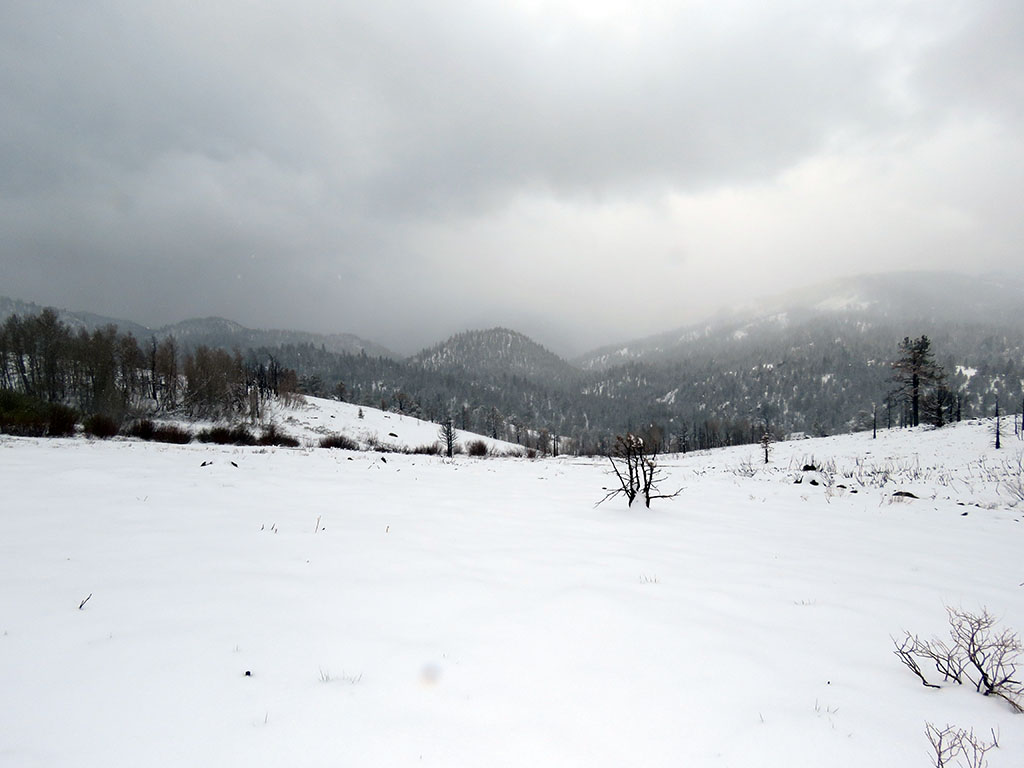 | As we start to climb away from the creek, I locate and stay on the trail. The snow is deeper here, and the storm isn't over yet. |
