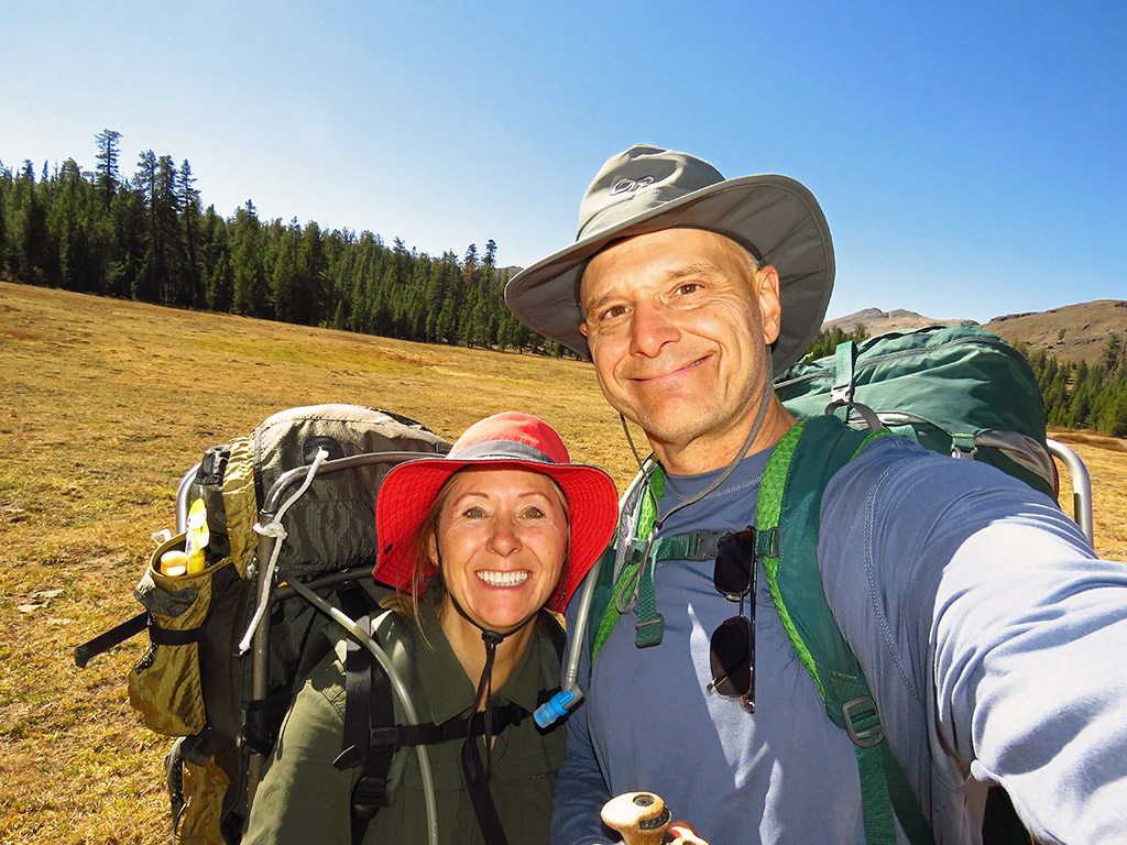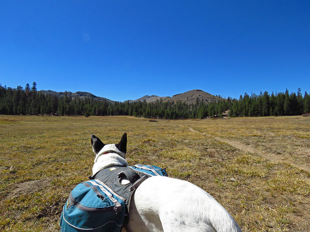 | Dawg looks ahead and is probably thinking the same thing, I am. Which way now? The meadow has a few intersecting trails at the far side including the aforementioned PCT and we must not peel off the wrong way. When we reach the trees some zigzagging was required to be sure we took the correct path. Once we were sure, we pressed on to the Lakes. | ||