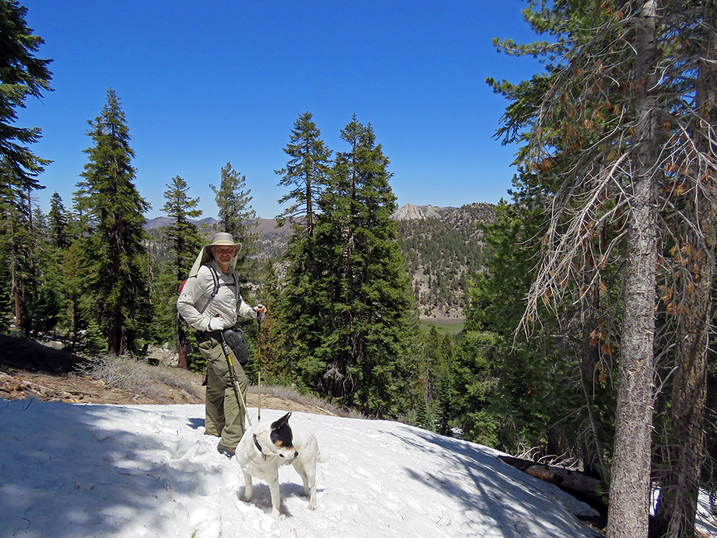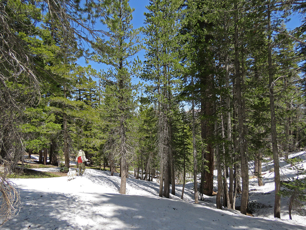 It is a shame we didn't take any pictures of the area where we turned around. The path to the lake got incredibly steep and just wasn't worth trying to continue. In addition, the snow depth was high and I was occasionally postholing through. This time I estimate we were only 400ft short of the lake shore. It was very hard to give up that close to the goal, but safety concerns prevail. Here we are already heading back to camp. |