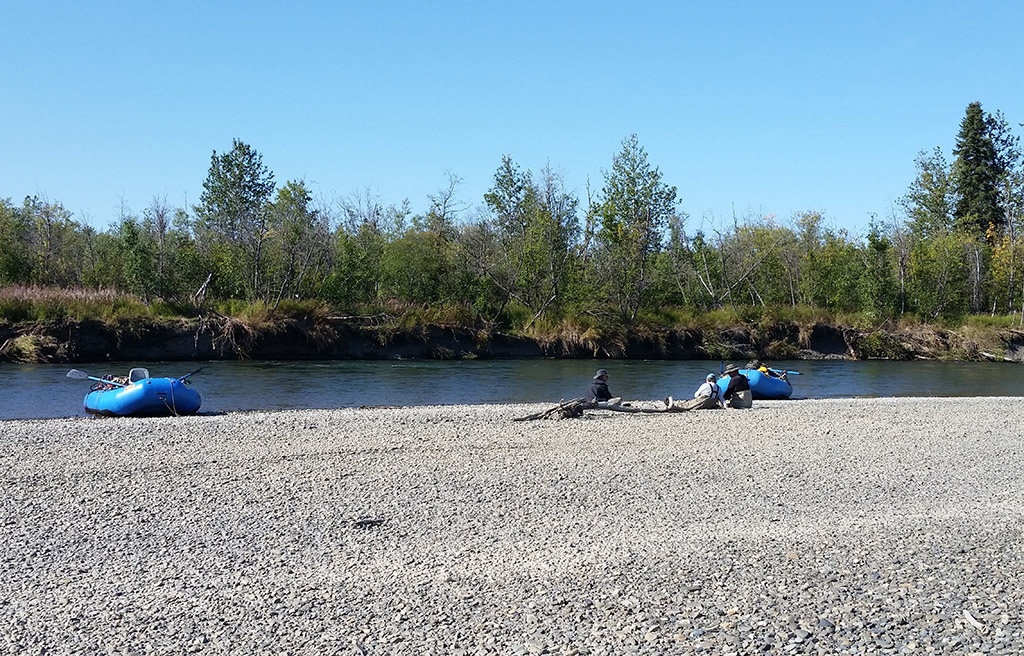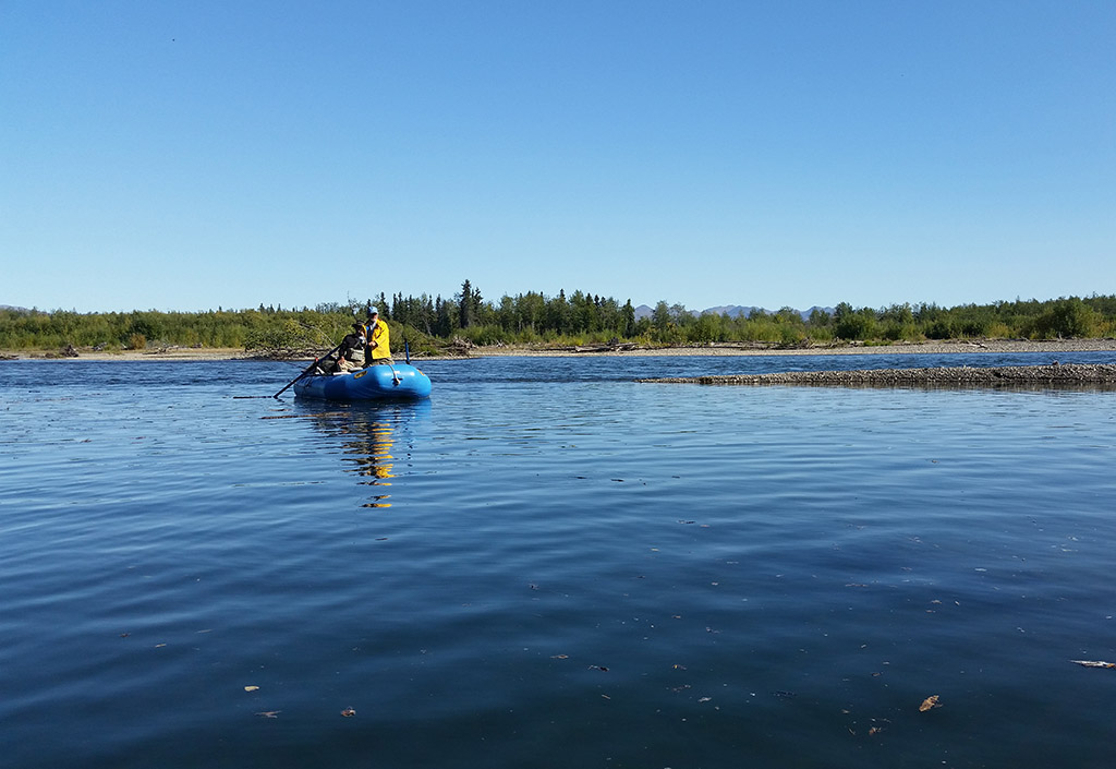 We turned up this side slough so that Dave and George could see if they could get any of the many salmon below to bite. As I remember, they were not successful. They got several fish following the lure and caught one trout, but the salmon were particularly lazy. |