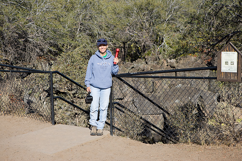 Driving back to camp we saw this sign for the Subway Cave. We thought that was an odd name and pulled off to check it out. Knowing that Andra has no substantial cave experience, I dug my MagLite flashlight out of the car knowing full well it would be totally inadequate in a zero light cave. Then I snuck my million candle power floodlight out and we headed for the entrance. This is at the top of the stairs just before Andra's "caving lesson." :) |