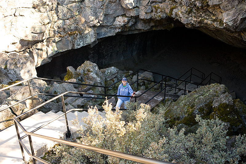This is a great picture of the stair entrance. Did I mention that the two entrances were formed when the ceiling collapsed? Hmmm... Here are some of the facts about the Subway Cave: Geology - Less than 20,000 yeas ago, the lava of the Hat Creek flow was discharged in large volumes from a series of north-south fissures (cracks in the earth). This river of lava located near the town of Old Station, crawled northward 16 miles, covering the floor of Hat Creek Valley. While the top crust cooled and hardened, rivers of red-hot lava insulated by newly formed rock above, continued to flow. Eventually, the lava drained away, leaving tube-like caves. The entrance to the cave was formed by a partial collapse of the cave's roof many years ago. Subway Cave is the largest accessible tube in the flow. The cave is entered on a stairway at a place where the former roof collapsed, called Devil's Doorway. Soon after the entrance a small widening of the tunnel is called Stubtoe Hall. Now the tunnel becomes rather narrow for some time, until Lucifer's Cul-de-Sac turns off to the left side. Now a wider passage goes to the biggest chamber of the cave called the Sanctum. The last part of the tube is again rather narrow and called Lavacicle Lane, because of the lava structures found here. Similar to the entrance the cave ends at a collapse of the ceiling called Rattlesnake Collapse. A last sight are the lava bubbles at the far right of this place. Now the cave is left on another stairway and a trail to the right leads back to the parking lot. Location - Subway Cave is located near the town of Old Station, 1/4 mile north of the junction of Highway 44 & 89 across from Cave Campground. Temperature - Temperature inside the cave remains a cool 46 degrees Fahrenheit year around. Be sure to take a jacket with you. Safety - Rough floor, watch your step, low ceiling, sturdy shoes advised! Season of Use - Cave is open late May through October. Closed during the winter months. Visibility - Visibility is zero. Take a dependable flashlight with you. There are self-guided trail signs inside. Length - 1,300 feet of winding lava tube. The total trail length is 1/3 mile. Roof - Thickness varies from 8 to 24 feet. Height - Varies from 6 to 17 feet. |