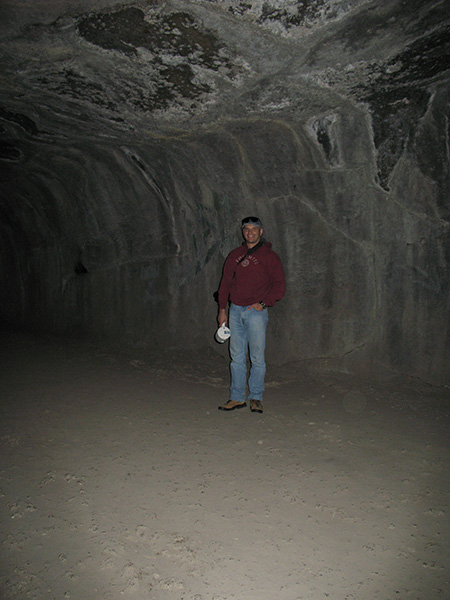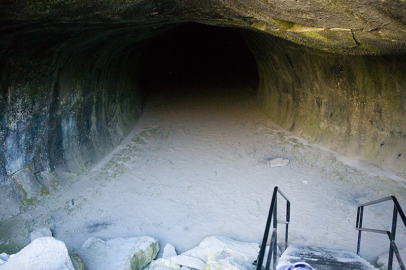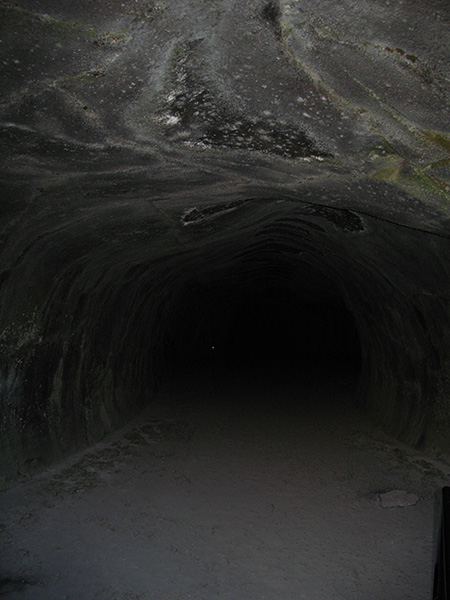| Just inside the cave Andra uses the built in flash on her camera for another photo. I had a chuckle when she shined my powerful MagLite into the dark tube and the cave just appeared to eat the light up for lunch. After a few minutes of her pointing it around the area trying to look at our surroundings, I popped on the million candle power flood and lit our entire section for an immediate - "Oh wow." | ||