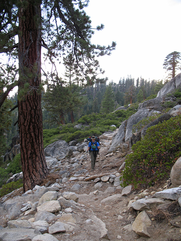 After breaking down camp we headed on to Cora Lake. This lake was supposed to be night one, with our second night at Saddler Lake. Since The Niche is not far from Cora Lake, we decided to only stop here for lunch and hike through to Saddler. That would put us back on schedule and keep trail mileages on future days from getting out of hand. You must remember that on each of these trips, I leave a detailed itinerary with a friend. Should we not contact him at the designated time, he is instructed to contact local emergency personnel. Coming out a day late due to poor planning, and being greeted by search and rescue teams, is not what anyone wants. To prevent this, all of our trips have extra time built into the schedule. Not only does this keep false alarms to a minimum, it allows you to have delays without having to kill yourself speed walking your way out. We're still getting a mixed bag of clouds, but no rain. The last update I got from the weather service showed rain Saturday and it's only Thursday. Still, the heavy clouds get you wondering if they have it right. |