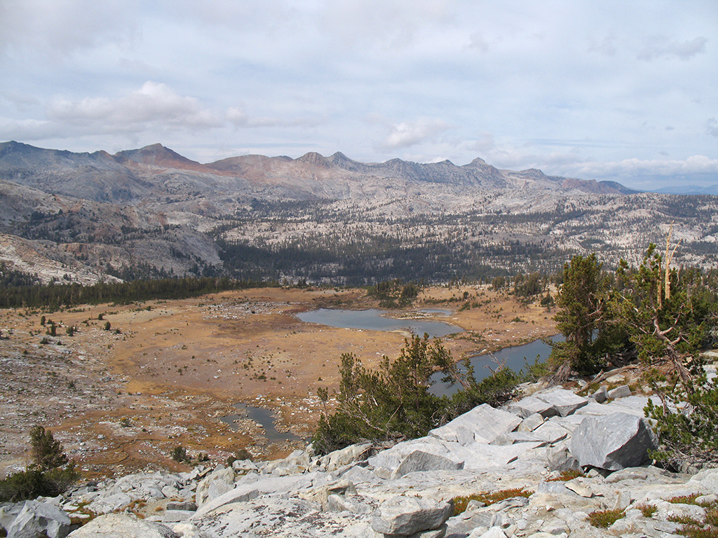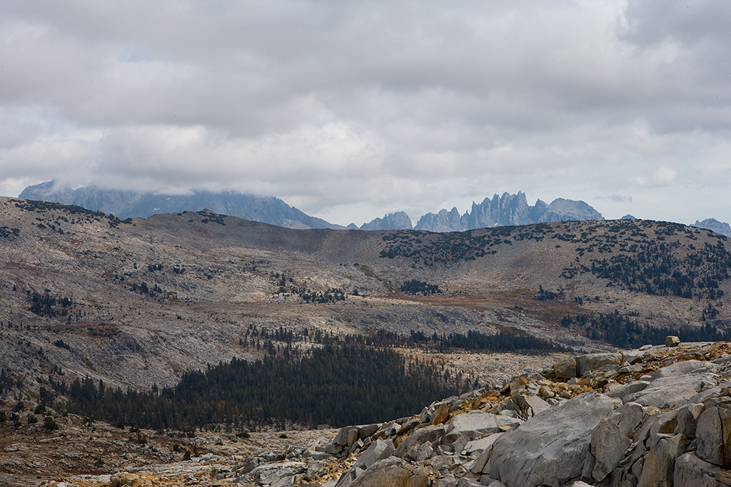 Looking back the way we came. The section on the left that is currently covered in clouds was particularly spiked. This mountain range is the home of the Minarets. Most view these spiked mountains from the Mammoth Lakes Ski area on the other side of the Sierras. |