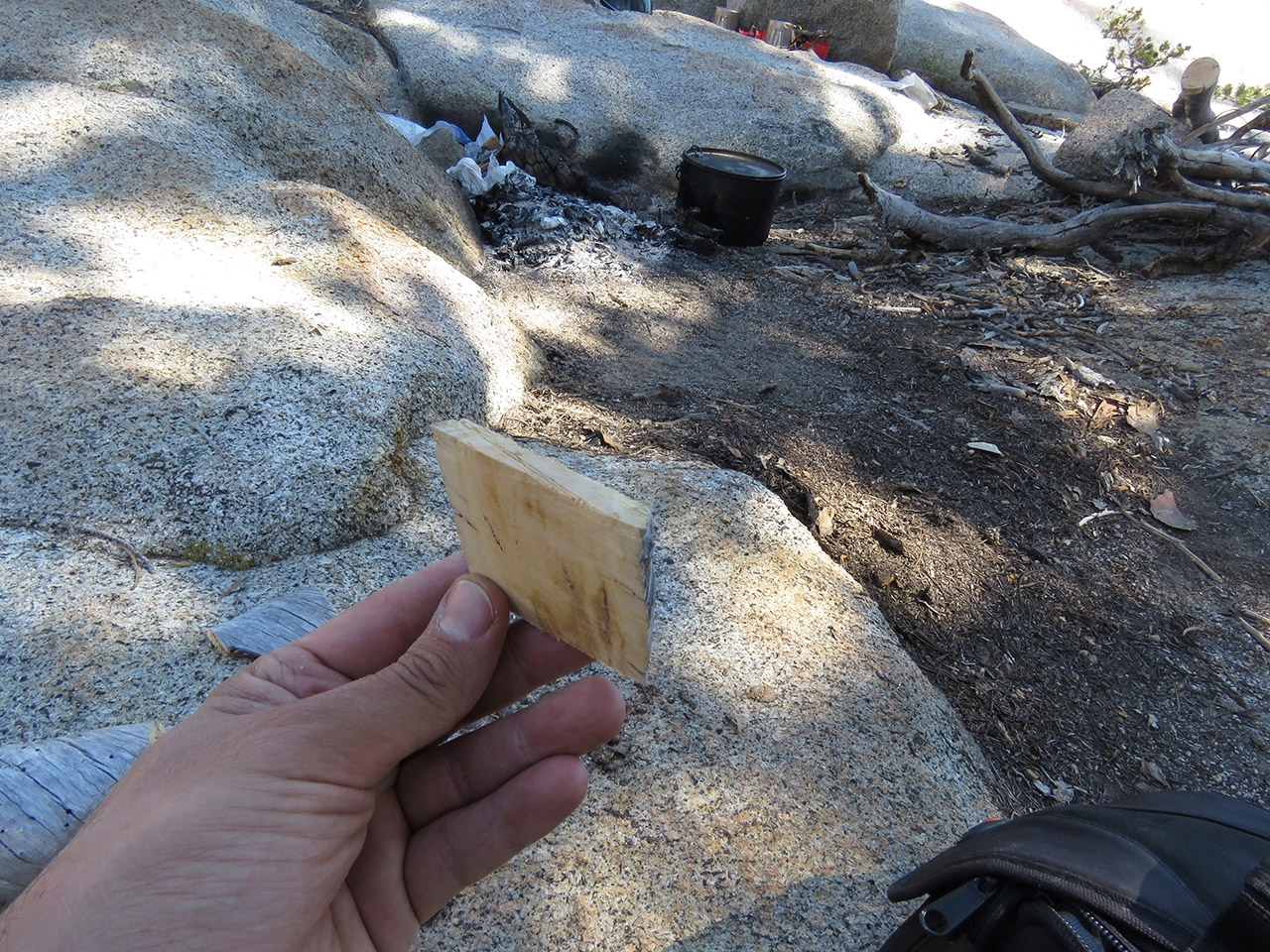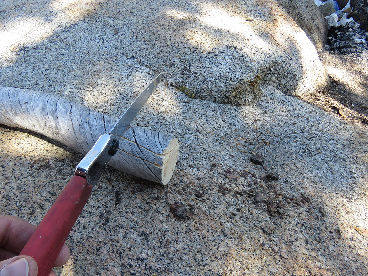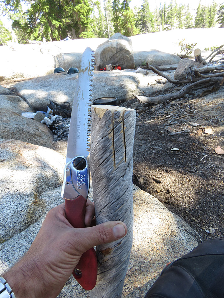 The last method for making fire without matches takes even more preparation and work. Here I am cutting a flat piece of wood out of a dry limb with my hand saw. Many of you may ask, "How would you do all this if you didn't have a saw or tools?" It gets extremely difficult without any tools whatsoever; however, with just a good knife you could do everything I did here - it would just take a bit longer. Anyone going into the backcountry without a knife is insane. A knife is so critical that I lack the appropriate adjectives to describe how important it is to have, and how moronic it would be to go without one. |