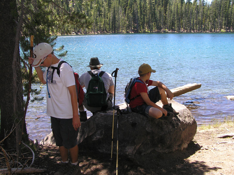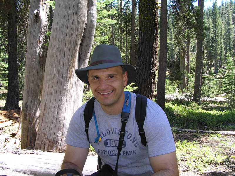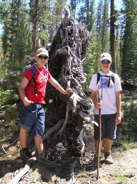 Brett and Brian stand next to a downed tree. The stump towers over their heads.