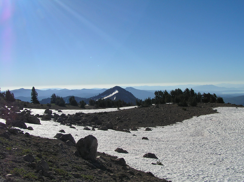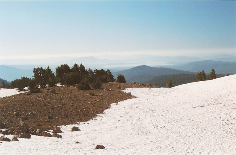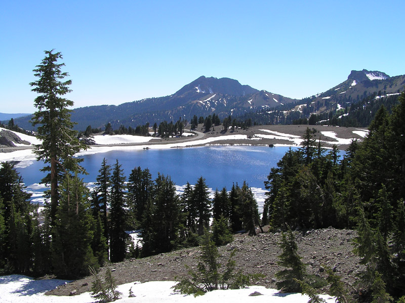 | On Sunday, we decided to get up early and try to reach the summit of Lassen Peak. We started at about 7:30am to beat the heat. Here, near the beginning of the trail, I photographed Lake Almanor in the distance. | ||