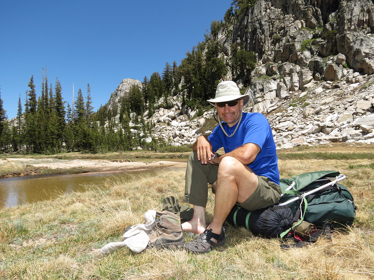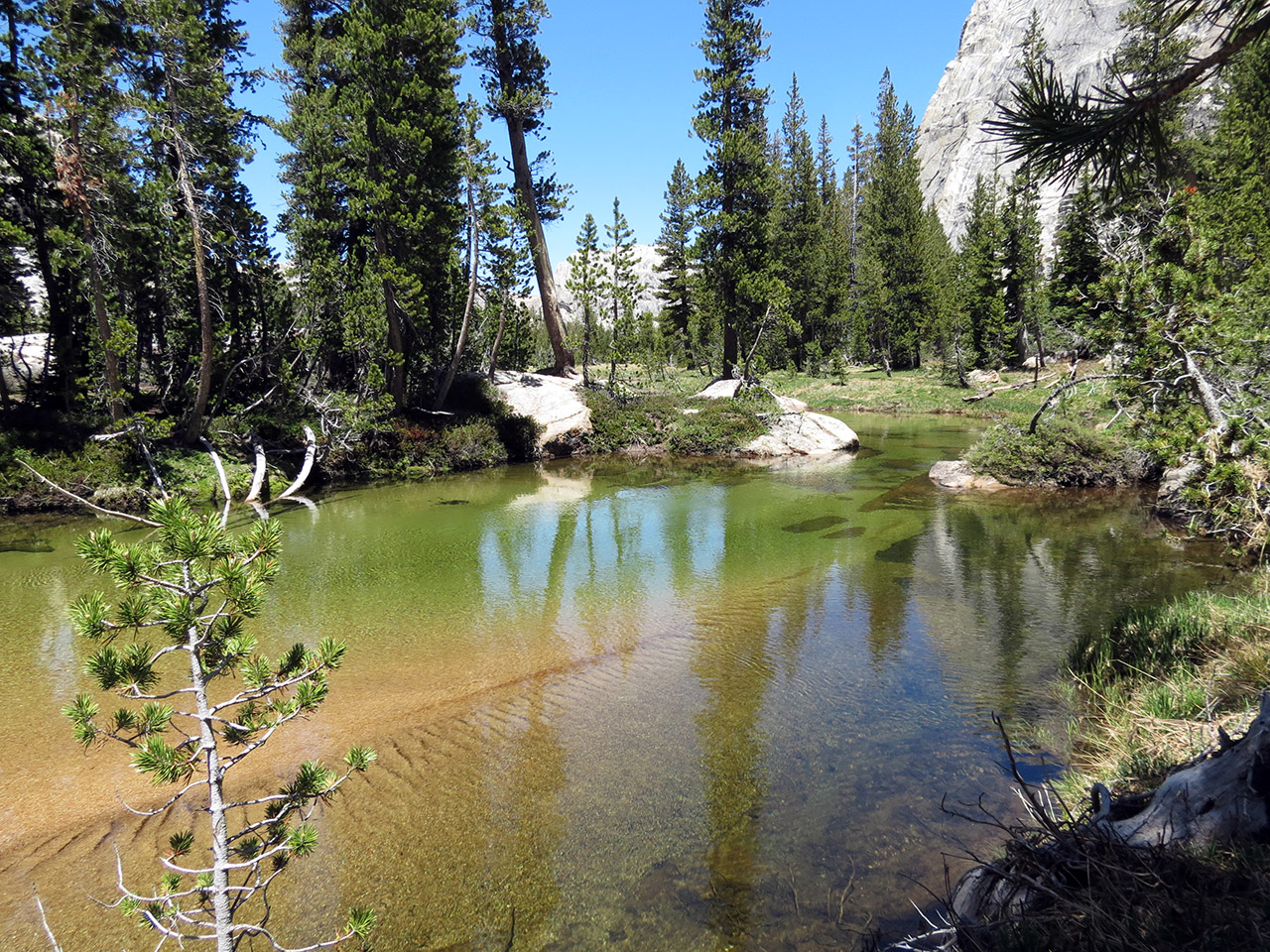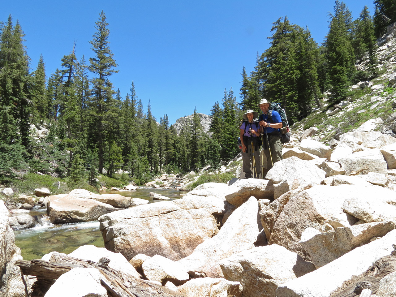 | I set up the mini-tripod on a rock along the creek to take this picture. We will continue upstream and then turn left. Unfortunately, trying to setup the camera for this shot, my foot slipped down a crack between the granite slabs and my shin slammed into the pointed edge of another granite slab with the full force of my weight and my backpack. It hurt like hell. I'm lucky the skin was not torn too much as most of the force was of the blunt trauma type. I didn't want to dress the wound here as we had another stream crossing about another mile ahead. I figured I'd deal with it right afterwards. |