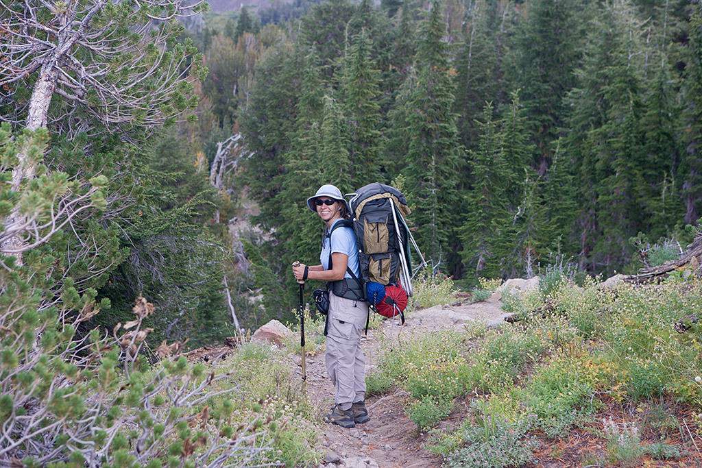 She pauses briefly for a photo before we continue down to the lake. Shortly after this picture was taken, a gust came in so hard it nearly flattened her. With a blast of high speed air catching her pack, she did everything possible to avoid face planting off the side of the trail. I was walking behind her and was amazed she managed to recover without going down. I'm also being pushed around by the wind, but have more muscle to fight off the erratic blasts. |