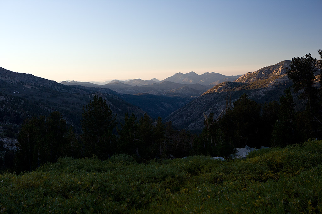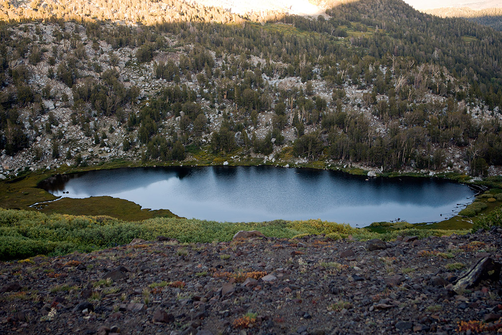 We continue our race against the sun. This lake is the first water source we pass, but it is too far away in the wrong direction (the photo is cropped making it appear closer). Despite the cold, I decide to wait in the mountain's shade to make sure Dave safely navigates a washed out section of the trail covered in snow. I didn't want to later be sitting in camp wondering if he had an accident at that nasty spot. Being day one of a long trip, our packs are heavy and can easily throw you off balance. In fact, I stumbled just before taking this picture in a section of trail not nearly as treacherous as what Dave must navigate through. Unable to catch my balance, I collapsed into the rocks ripping my pants and cutting my knee. I know I need to dress the wound but figured I would wait until we make camp before trying to break out first aid supplies. |