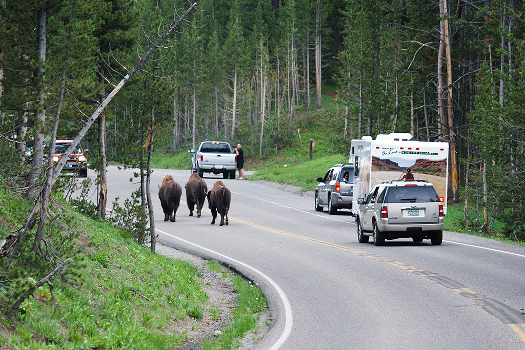 | Traffic jams in most cities occur when too many people are using the road. In Yellowstone, they are generally caused by animals. In this case three bison decided to walk up the road. |