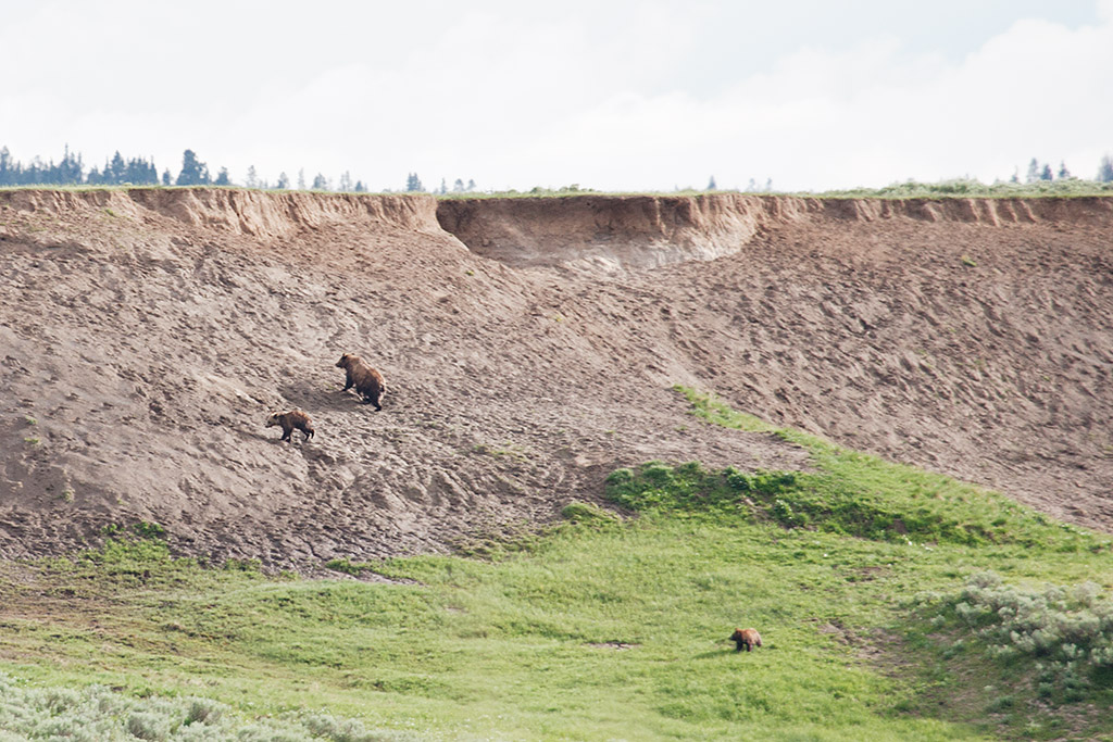 | A mother grizzly bear and her two cubs. The fuzzy picture is due to the distance and high winds. I'm using my 400mm lens on a tripod, but the high winds are shaking the whole camera. This photo was also cropped by half to better enlarge the bears. The best place to observe grizzly bears in Yellowstone is... from a great distance. :) |