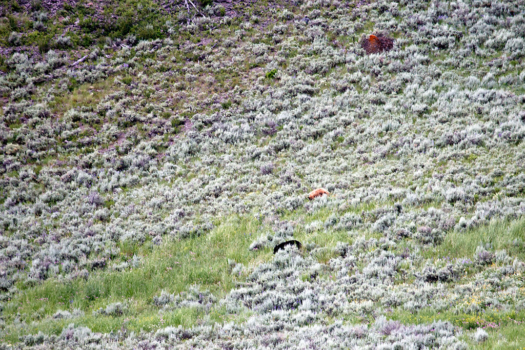 | We intentionally drove into Lamar Valley near sunset to look for moose. In prior trips we saw just about every type of large animal except moose. We were determined to fine one and while looking, spotted these two brown bears coming down the hillside. | ||