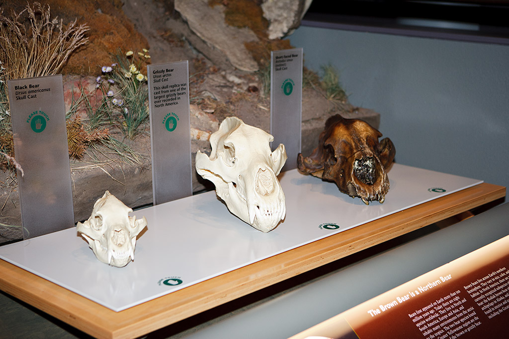 | The center sports some impressive wildlife exhibits among other things. Black bear skull left. Grizzly bear skull middle. One of these bears is known to eat the other. You guess which. | ||