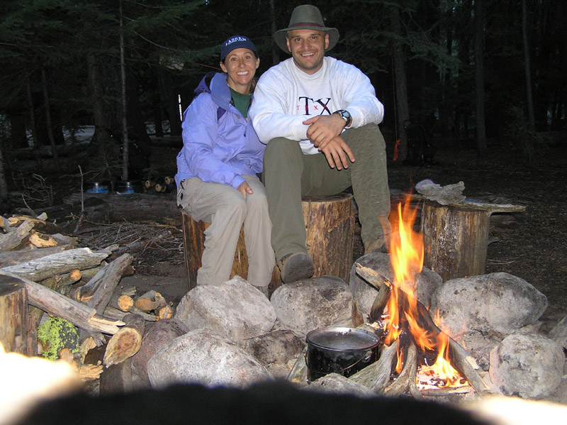 | That evening we enjoy the fruits of my labor as we wait for our pot of water to boil. Note the heat waves, wrinkling up my pant leg. It makes it look like my pants need ironing. We met a nice guy from Ireland (Ali McCord) while staying here. It was his first time to the States and he too planned to hike to Half Dome the following day. | ||