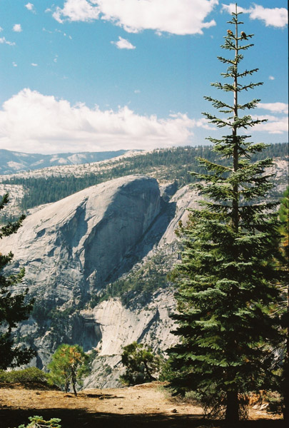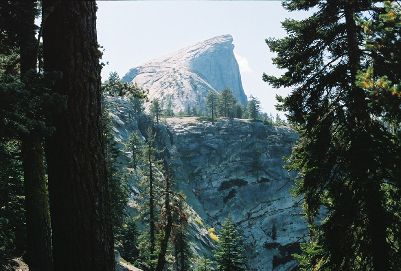 | From the trail we get our first view of the sub-dome with Half Dome behind it. | ||