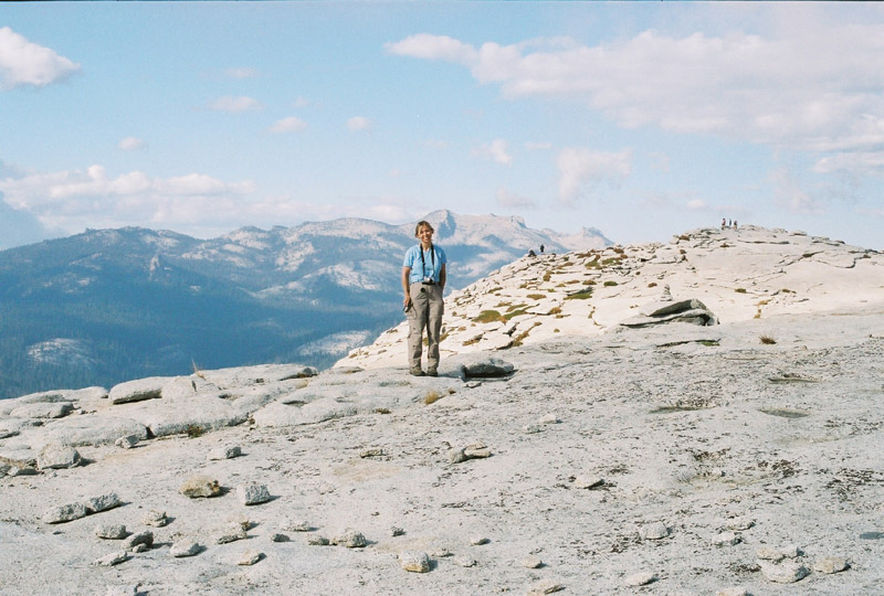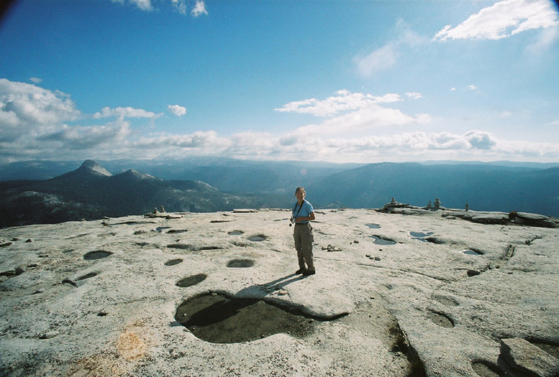 | We walked over towards the west side of Half Dome and took a look at the cairns piled high by the rock climbers. Many climbers climb up this side of Half Dome and the tall cairns near the top help them stay on course as they reach the summit. | ||