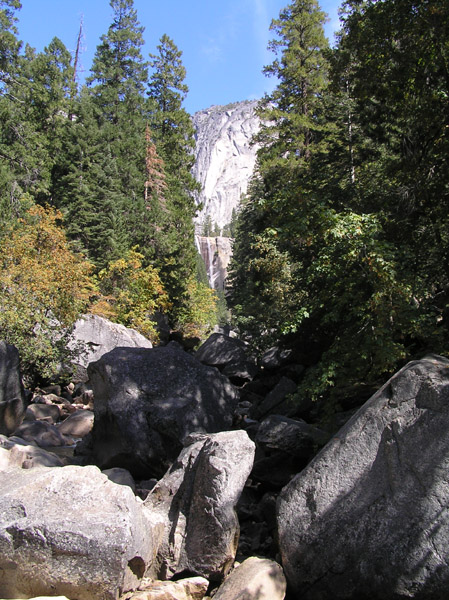 | We've finally reached the bridge below Vernal Falls. It too looks anemic. When we finally reached Andra's car at the Happy Isles backpacker's parking lot, we sadly discovered that vandals had broken her passenger side mirror off. They threw a piece of cinder block at it, deeply gouging her passenger side window and smashing the mirror and assembly right off. Simply disgusting. |
