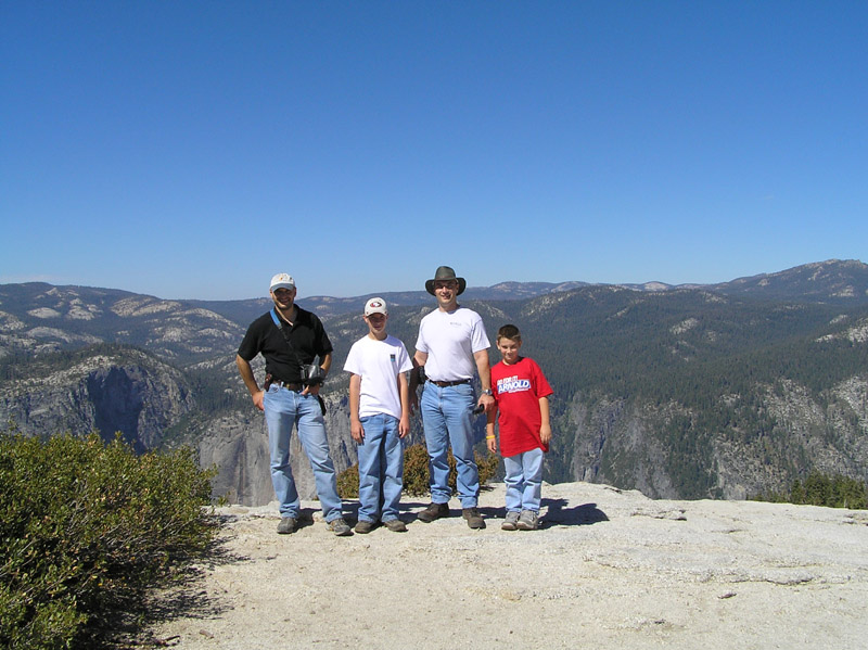 | From Glacier Point we drive back and hike to the top of Sentinel Dome. You can see dry Yosemite Falls just to the left of my leg. | ||