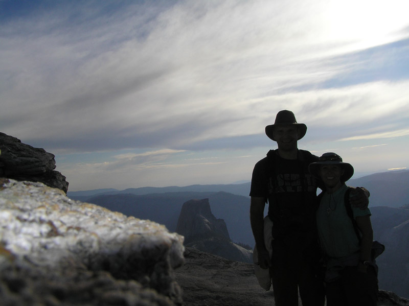 | Before we left Clouds Rest, Andra wanted to get a picture of us together. Unfortunately she still hadn't come to grips with the 5 to 6ft maximum range of her flash; however, the picture looks nice anyway. Besides, you have to admit, the blurry rock surface is nicely lit. | ||