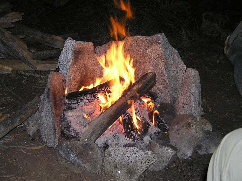 | Earlier we had found a nice camp spot near the ice cold stream I was searching for (I like my water cold), and there was a little rock ring fire pit from a prior backpacker. Seeing some nice rock pieces laying around, my innate engineering tendencies took over. I rebuilt the cute little nearly useless ring into this. It's hard to see the scale here but the rock back is nearly two feet tall and we really enjoyed it. | ||
