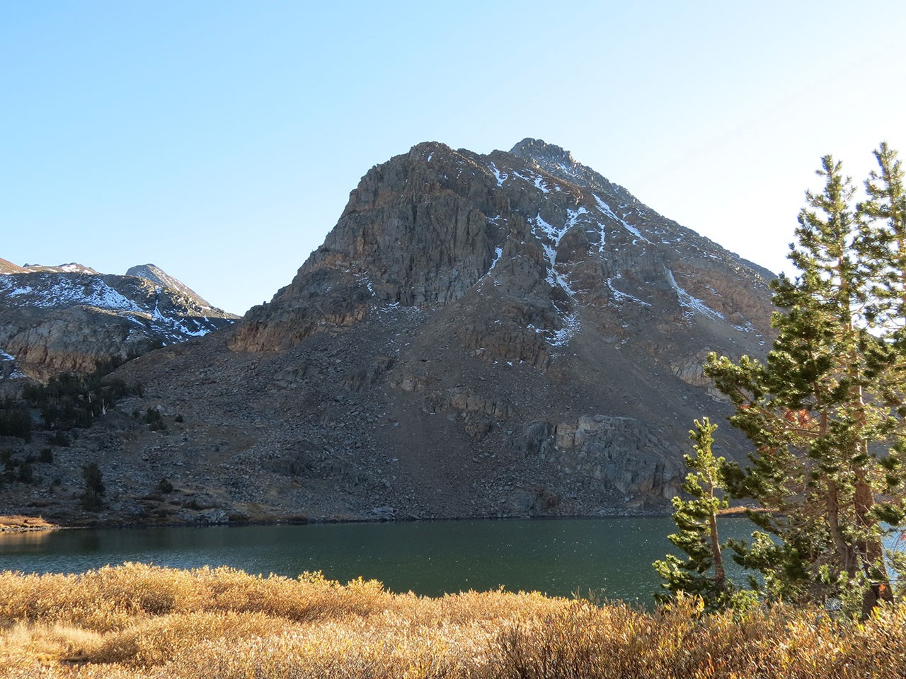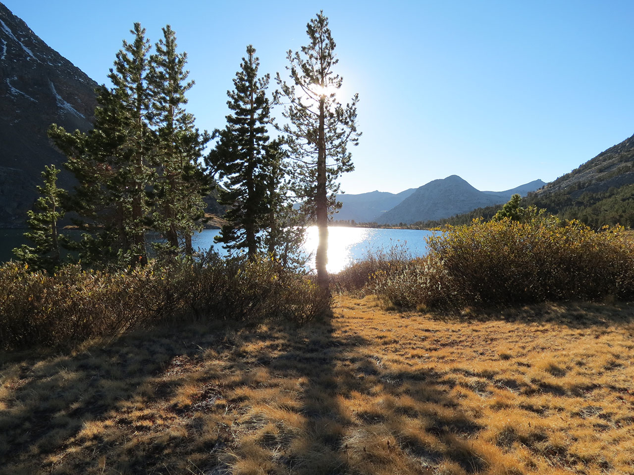 | Just before reaching Summit Lake, Dave informed us that he's about done. With an extra heavy pack, the high elevation and the relentless climb he's spent. He not only didn't want to continue to reach a location we could have a fire, he didn't even want to continue to the far end of the lake which was our original plan before we discussed the fire/food issue. We too are very tired and pushing too hard on day one isn't going to help anyone. Andra and I agreed to stop as soon as we reached the lake. We dropped our packs and enjoyed the evening colors as we waited for Dave to arrive. | ||