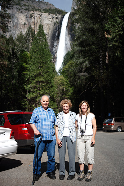 Dad, mom, and Andra pose for a photo in the parking lot. Just to the left of the red car, the parking lot was flooded with about two inches of water. Since we needed to make camp and check mom and dad into their hotel, we decided not to try and slosh our way to the trail to get any closer. |