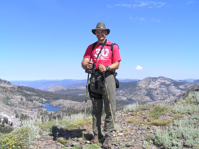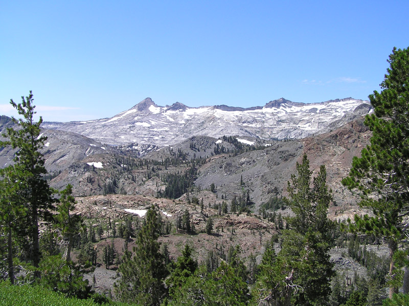 | As we begin to drop down the slope, Andra captures the granite landscape that makes up Pyramid Peak. | ||